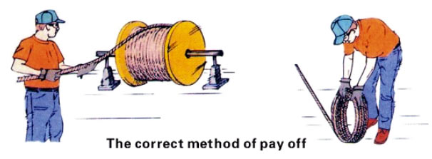 For wire rope with reel, place the reet on a stand which allows the reel rotate, control the rotation speed of the reel, pull of the wire rope slowly. For wire rope without reel, pull the wire rope in the direction reverse to the end of wire rope.